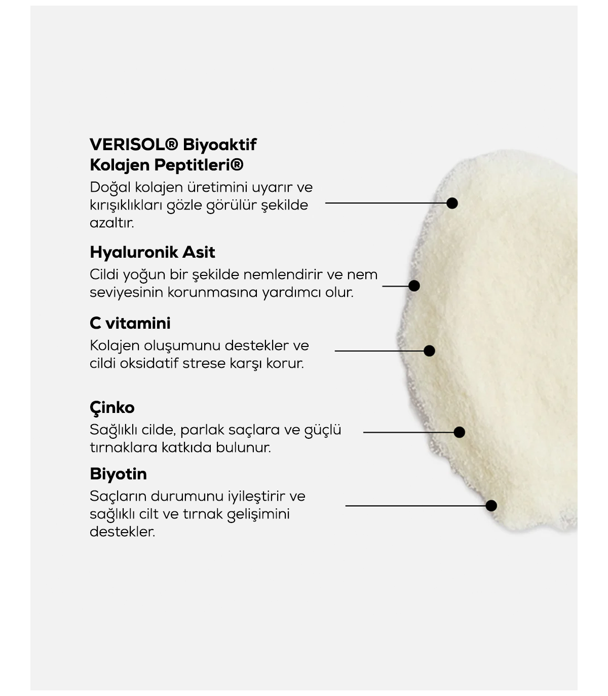 VERISOL® Kollagen pflegt die Haut nachweislich von innen heraus und reduziert sichtbare Zeichen der Hautalterung. Es reduziert Fältchen und feine Linien und verleiht der Haut ein strahlenderes Aussehen. Es macht die Gesichts- und Körperhaut weicher, glatter und geschmeidiger. Es kann auch dazu beitragen, das Erscheinungsbild von Cellulite zu reduzieren.