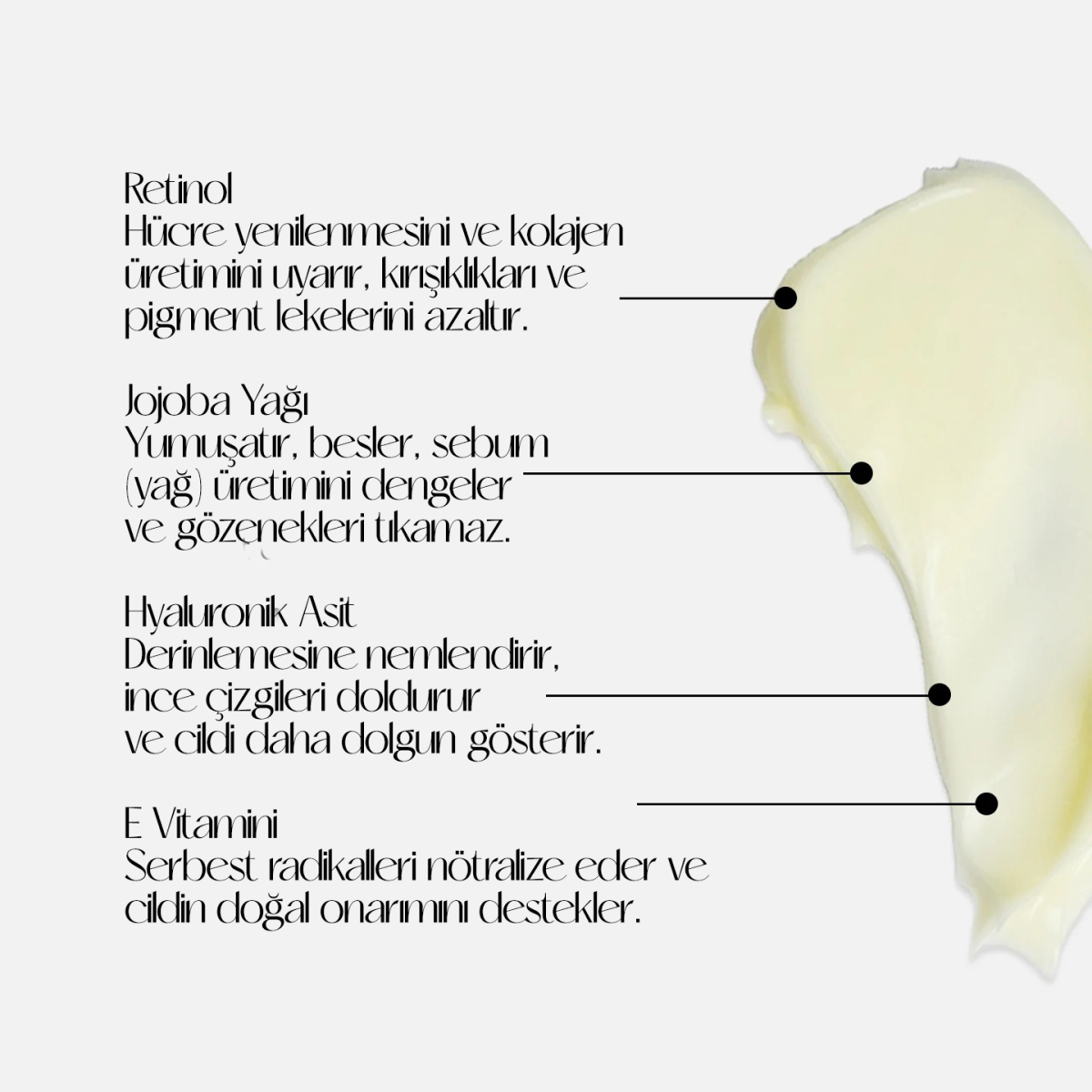 Aqua, Butylenglykol, Trehalose, Cetearyl Olivate, Sorbitan Olivate, Capryl/Caprin, Triglycerid, Cetearylalkohol, Isononylisononanoat, Retinol, „Simmondsia Chinensis (Jojoba) Samenöl“, Portulaca Oleracea-Extrakt, Camellia Sinensis-Blattextrakt, „Arnica Montana Blüten“-Extrakt, Natriumhyaluronat, Tocopherol, Xanthangummi, Allantoin, Phenoxyethanol, Ethylhexylglycerin, Duftstoffe.